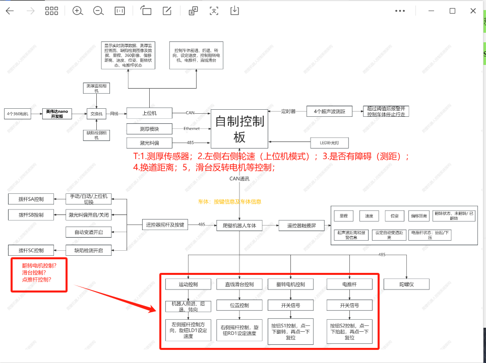 控制板实现,机器人的运动控制、翻转电机的控制、直线滑台的控制,预留Can接口(前进、后退、左转、右转对应的通讯协议),供电模块和操作手柄
