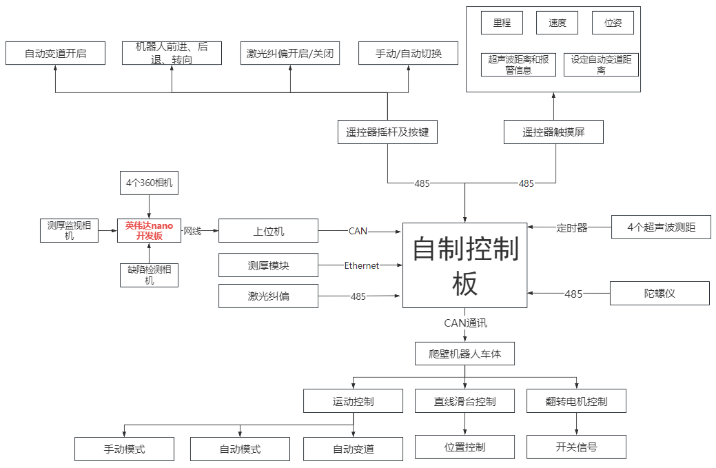 水冷壁检测项目需求,英伟达主板在机器人本体上、我方提供运动接口(如左转右转、前进后退等运动信息)开放给甲方(英伟达主板CAN通讯协议),主控在电脑端,在手柄上安卓界面设置三种控制模式,手动(遥控器控制)、自动模式(上位机控制,手柄可介入操作)。